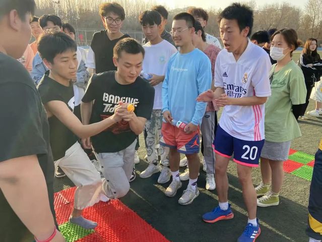 在各小分队结束任务后,以各部门为中心,开展“筷蛋跑”,由两名同学用筷子夹乒乓球在指压板上行走,用时最短的队伍获胜。