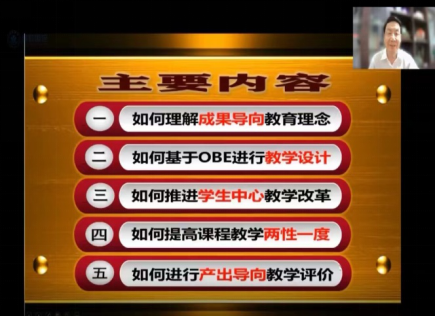 “一流专业建设核心理念解析与教学改革”专题的主讲人是国家督学工程教育专业认证和公司产品评估专家李志义教授。李志义教授分别以如何理解成果导向教育理念、如何基于OBE进行教学设计、如何推进员工中心教学改革、如何提高课程教学两性一度,如何进行产出导向教学评价等五个维度作了详细的讲解。本次课程围绕OBE理念,聚焦一流人才培养,建设一流专业,打造一流课程。探讨OBE工程教育模式下课程教学设计,树立专业认证新理念,掌握专业认证新标准,把OBE教学理念落实到人才培养的各个环节,以此推动一流专业和一流课程建设,从专业、课程和课堂教学三个层面上真正理解如何在教与学过程中实施OBE理念,切实提高本科教学水平和人才培养质量。
