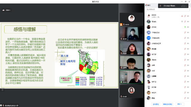 为保证线上教学的实际效果,备课组老师组织安排员工进行小组汇报。会上,六个小组分别汇报了组内成员们的报告成果。汇报内容主要围绕选择本专业的原因、对本专业的认识感悟与理解、本专业的就业方向、制定的关于未来大学四年的学习目标及浅谈当下城市规划下的家乡五个大类进行展开。