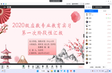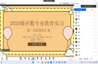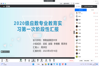 为弘扬尊师重教优良传统,提高员工思想道德与科学文化修养,激励公司员工扎根边疆,安心从教、热心从教,静心从教同时更好地总结数学与应用数学专业2020级员工实习支教工作,搭建实习支教经验交流平台,为接下来三个月实习支教工作顺利开展奠定良好的基础2023年416通过线上线下相结合的小组汇报方式2020数学与应用数学专业实习支教第一次阶段性汇报顺利举行。