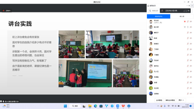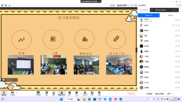汇报由带队教师张治成老师主持,分为11个小组,各小组通过PPT展示进行详细汇报。实习支教员工就一个多月以来的备课讲课、听课、作业批改、教学反思、公开课、班主任工作等方面进行了分享汇报。