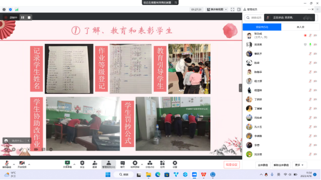 本次实习第一次阶段性汇报大会已逐渐进入尾声,实习带队教师张治成老师通过责任、情怀、幸福三方面对本次线上汇报会进行回顾和总结。表示,实习支教工作是师范生的一项重要的学习任务,也是一次难得的挑战,鼓励实习教师要踏踏实实做好每一份教学工作,去感受做一名教师的幸福感并从如何跟随指导教师学习、实习的每日听课、实习公开课、线上常规课等方面提出了具体要求,取长补短确保实习工作落到实处。希望同学们能够继续保持钻研教学的热情,突破难点的勇气以及持之以恒的态度,在今后的学习实践中不断成长