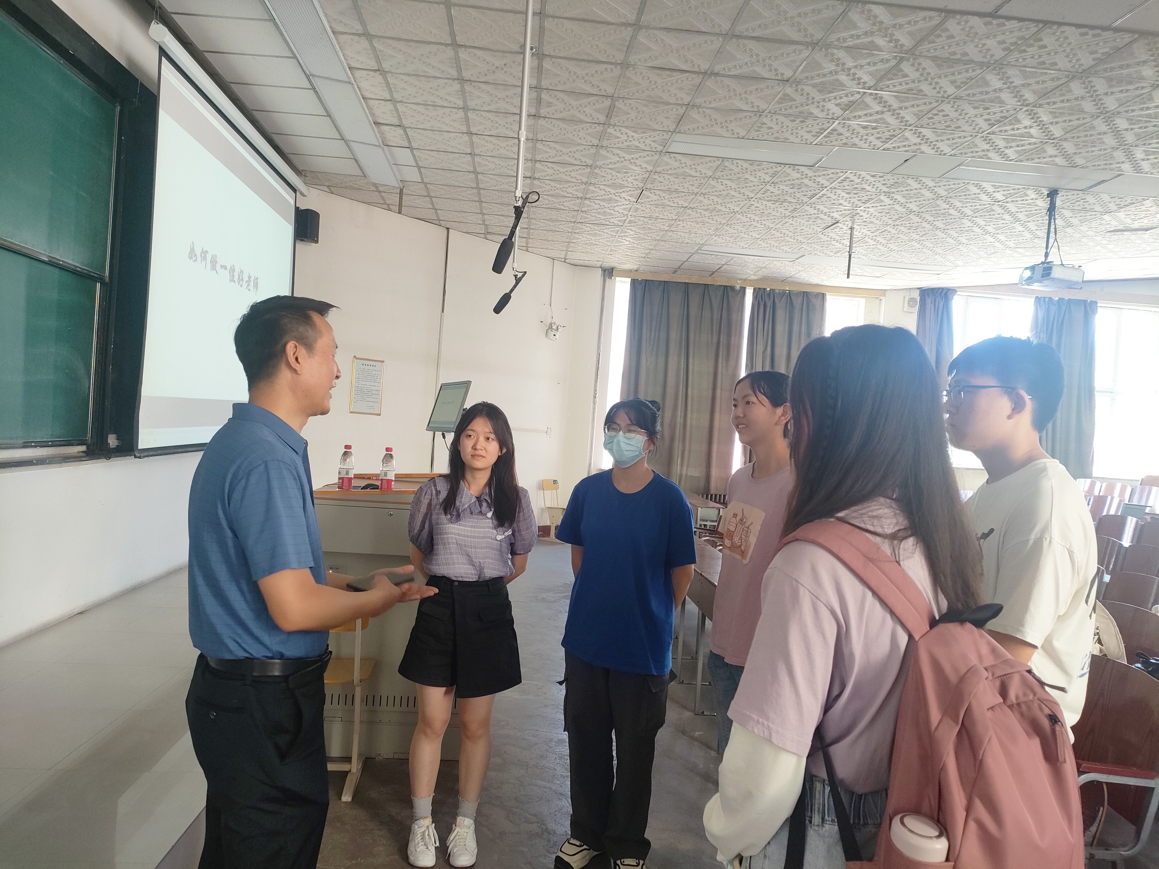 钱老师首先对“中国教育要培养什么样的人”引出教师应具有高尚品质-家国情怀-大先生-“四有”好老师。之后钱老师就现在最新的教育案例和自己的亲身经历给同学们介绍老师应具备的五大素质,引起大家的兴趣,同时也引起大家对做一个好老师的反思。报告结束后,很多同学向钱老师请教做老师的一些细节以及自己的一些困惑,钱老师一一耐心作答。通过这次报告同学明白了怎么做一名好老师,如何努力做一名好老师,并且大家表示这个报告对他们非常有用,通过钱老师与同学们热烈的交流,我们相信将来我们一定会培养出一批优秀的好老师。