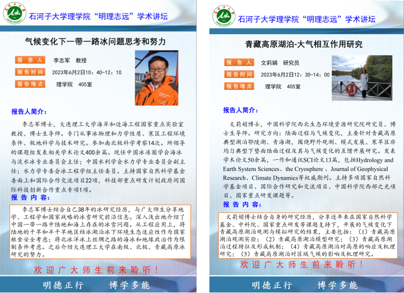 黄文峰博士和王月健教授分别以“中纬度寒旱区湖冰过程及其水文与水生态效应”和“干旱区典型尾闾湖干缩化及其成因探讨”为主题,探讨了各自领域的研究成果,赢得同学们广泛关注。