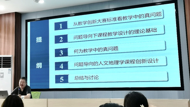 此次学术报告围绕从教学创新大赛标准看教学中的真问题、问题导向下课程教学设计的理论基础、何为教学中的真问题、问题导向的人文地理课程创新设计和总结与讨论等五个方面展开。
